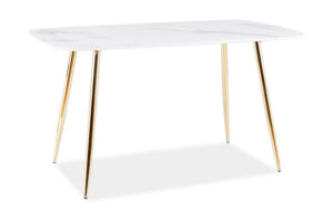 Ruokapöytä Kore 140 on kaunis yhdistelmä visuaalista keveyttä ja käytännön mitoitusta. Pöytä tarjoilee kompaktiuden ilman vaikutelman pienuudesta: sen valkoinen lasikansi jäljittelee marmoria sävyiltään ja kuvioinniltaan, tuoden pienen tilan pirteän modernin fiiliksen. Kultaiset metallijalustan yksityiskohdat korostavat eleganssia ilman raskaan oloista ulkoasua. Rakenne yhdistää MDF:n ja lasin keveyden sekä metallin vakauden, mikä luo tunnun huolitellusta kokonaisuudesta.